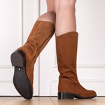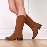 Découvrez nos bottes mi-hautes Alama en croute de cuir cognac. Élégantes et confortables, ces bottes plates sont parfaites pour accompagner une jupe ou robe longue. Nos bottes Alabama ont un un style intemporel et sont faciles à accessoiriser. On les matche avec une robe longue pour un look folk !