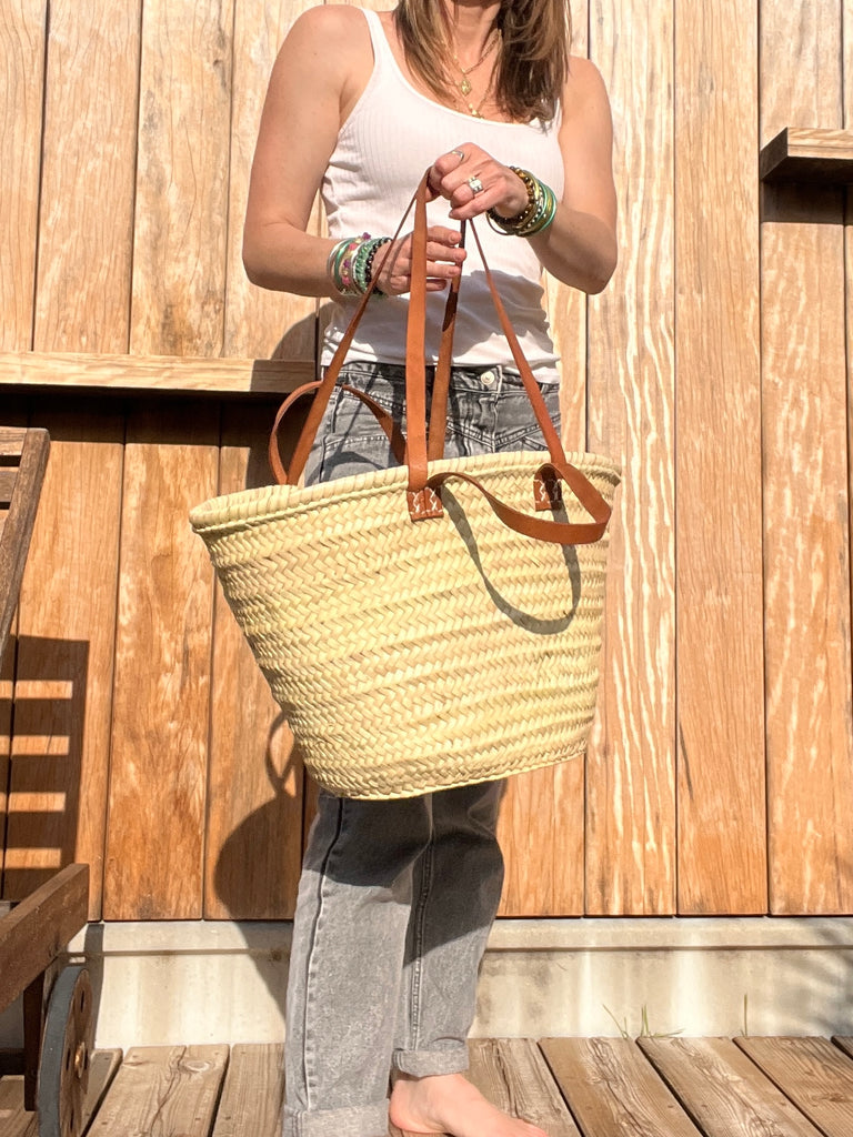 Notre Panier Doriane, fait office de sac à main élégant et pratique avec sa taille parfaite. Fabriqué à la main par notre artisan à Marrakech avec de la palme tressée. Ses anses en cuir camel, sont pratiques elles permettent de porter votre panier à la main ou à l'épaule. Ce panier apporte une touche sophistiquée à votre look. Parfait pour vos escapades estivales ou pour compléter votre tenue avec une touche de chic à la Française.