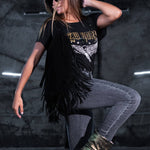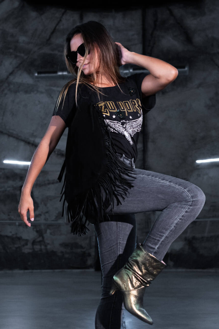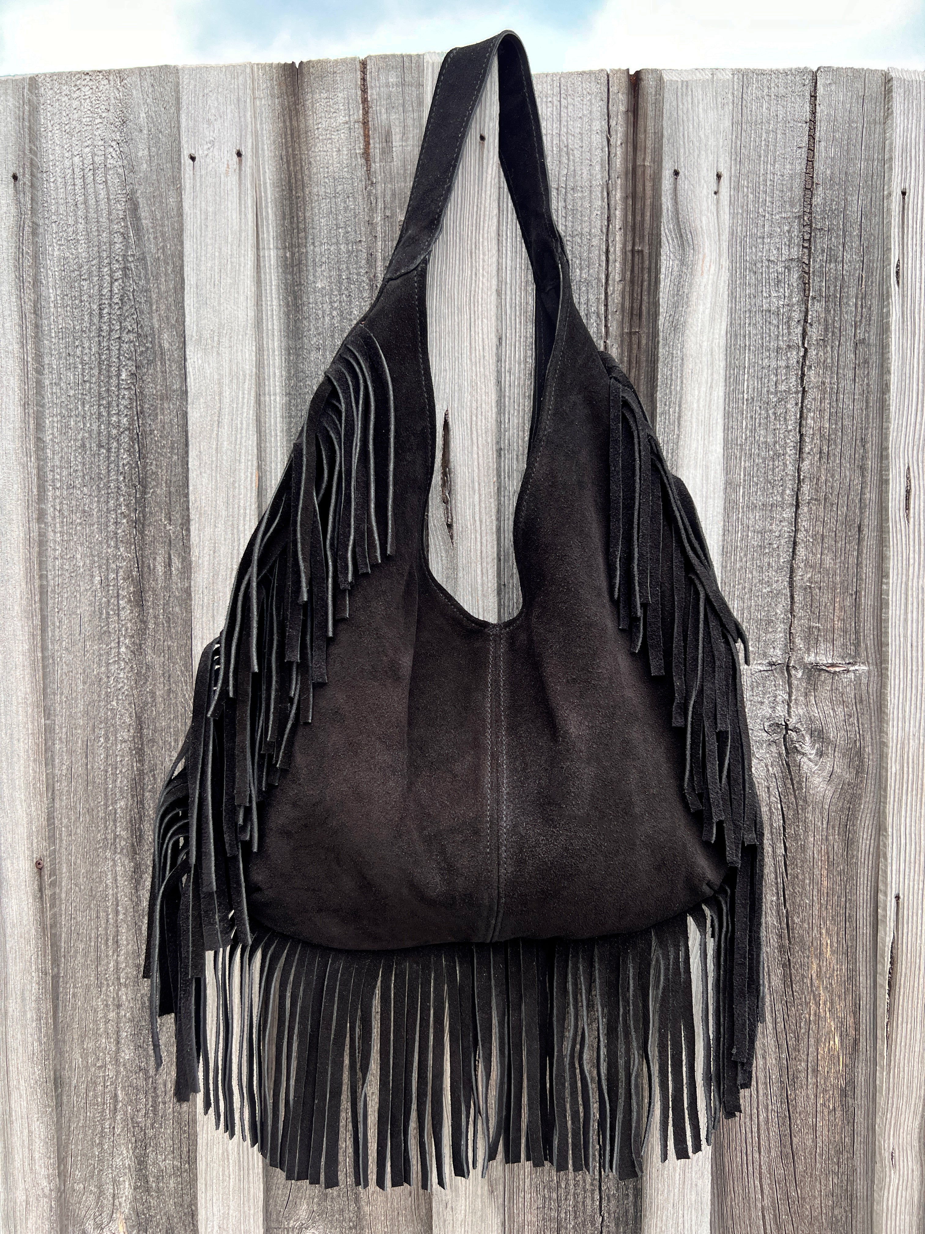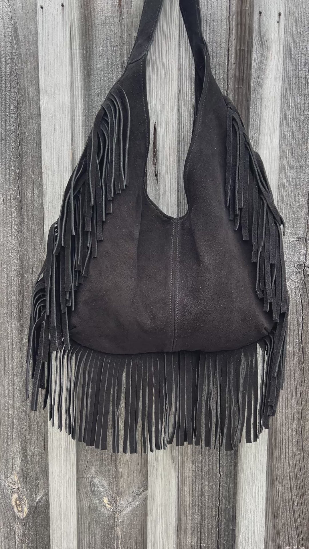 Affirmez votre style avec le sac Tulsa, la pièce forte qui insuffle une touche folk chic à toutes vos tenues. Confectionné en croute de cuir noire douce au toucher, ce sac à main séduit par son allure bohème assumée, soulignée par de longues franges fluides sur les côtés et le bas. Sa forme souple et son grand format en font un compagnon idéal au quotidien : pratique, confortable à porter à l'épaule, et résolument tendance.