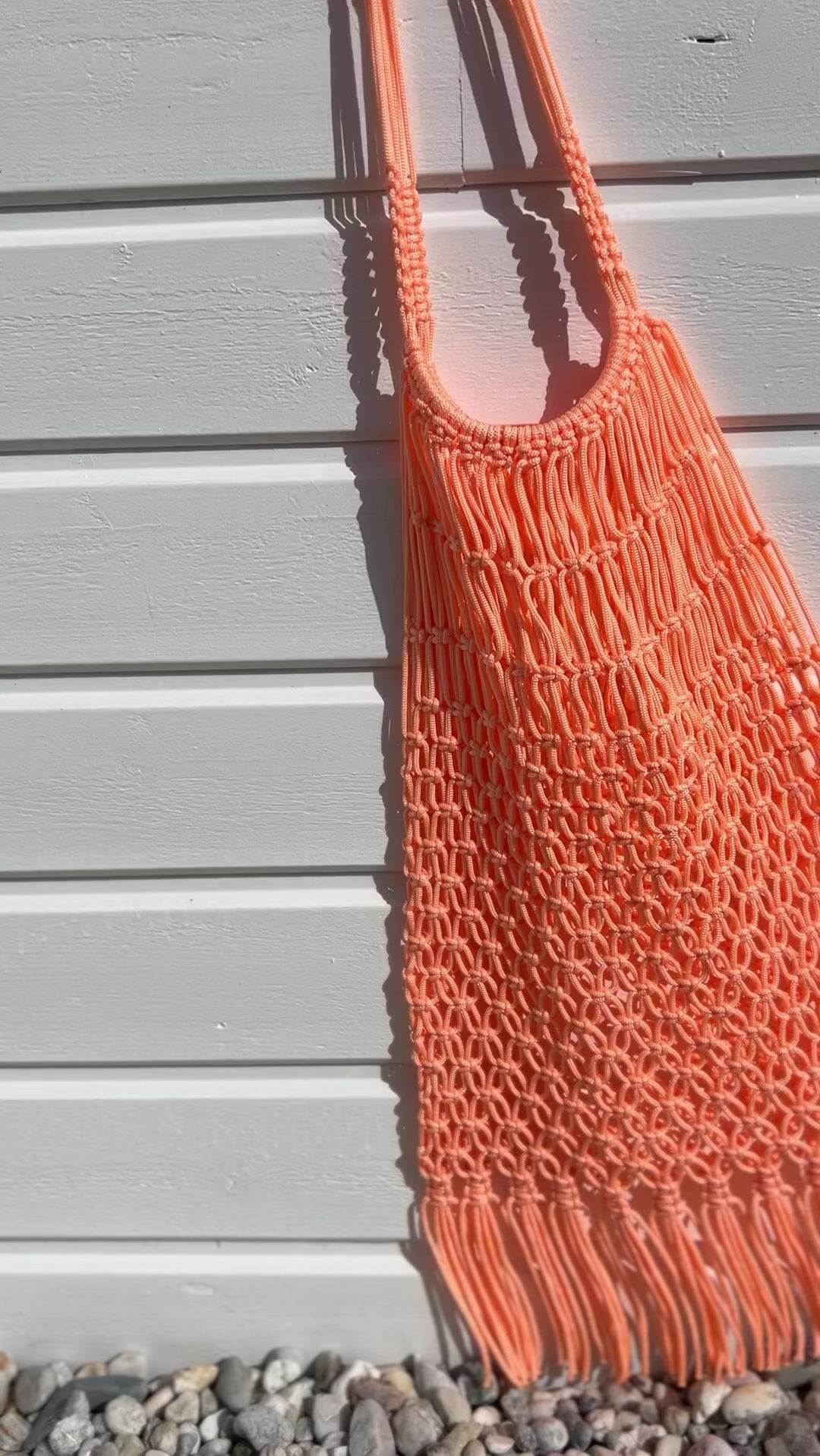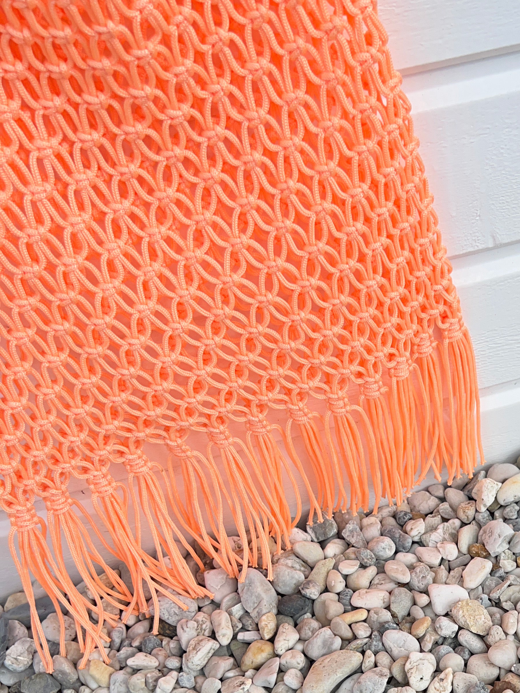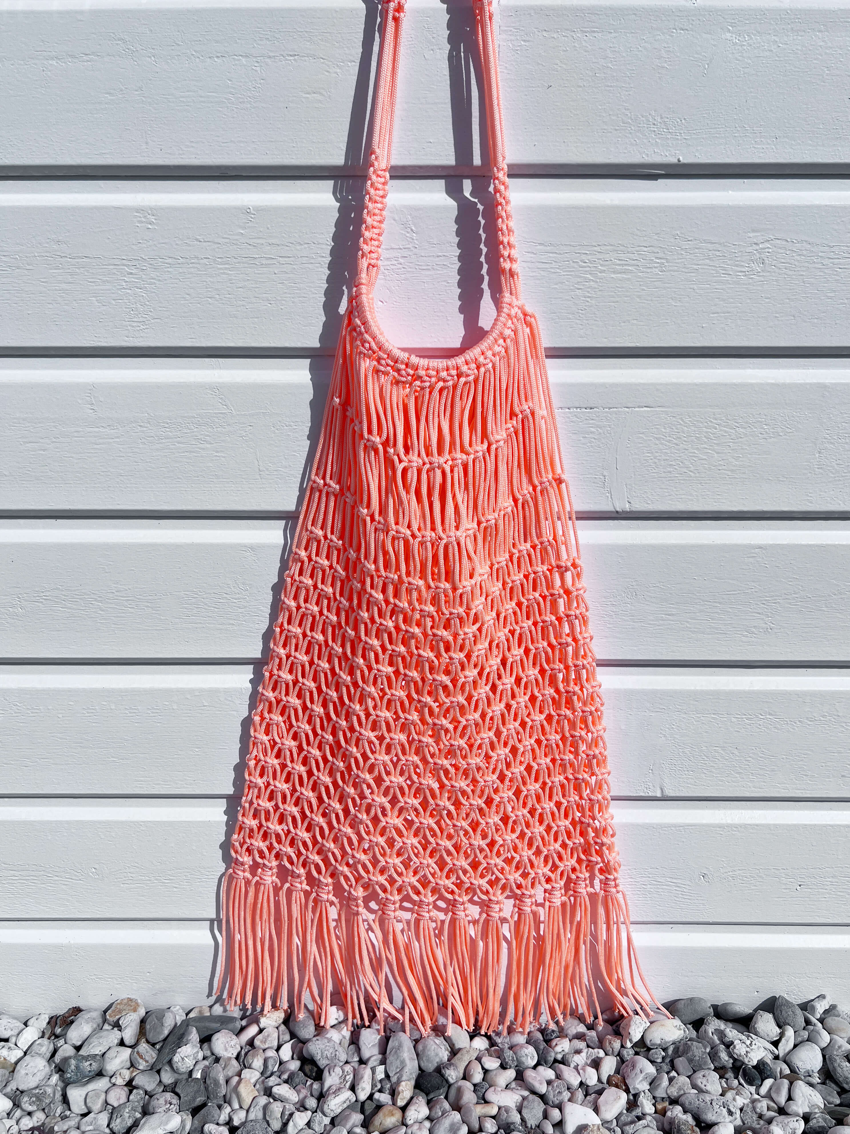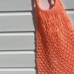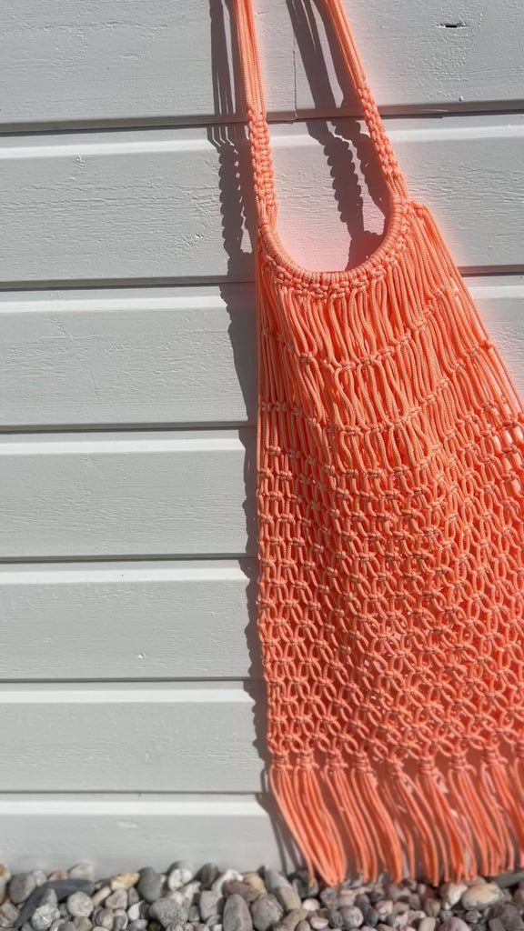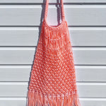 Doux, lumineux et résolument estival, ce sac filet corail à franges apporte une touche solaire et féminine à la silhouette.