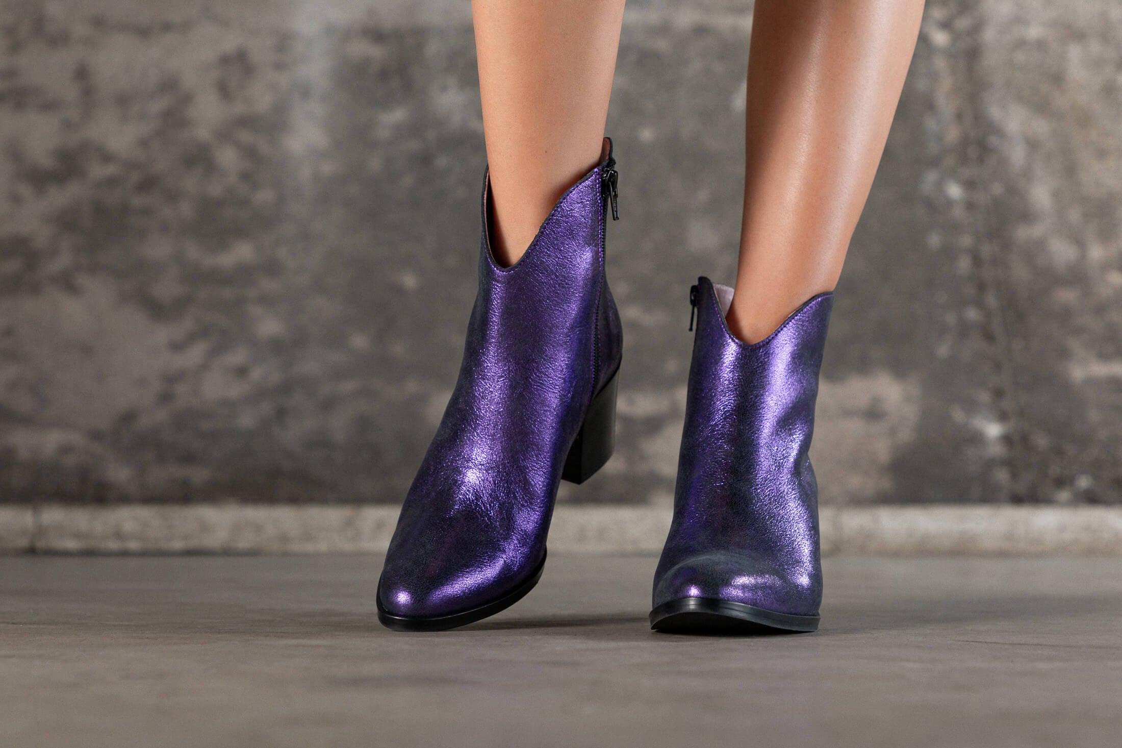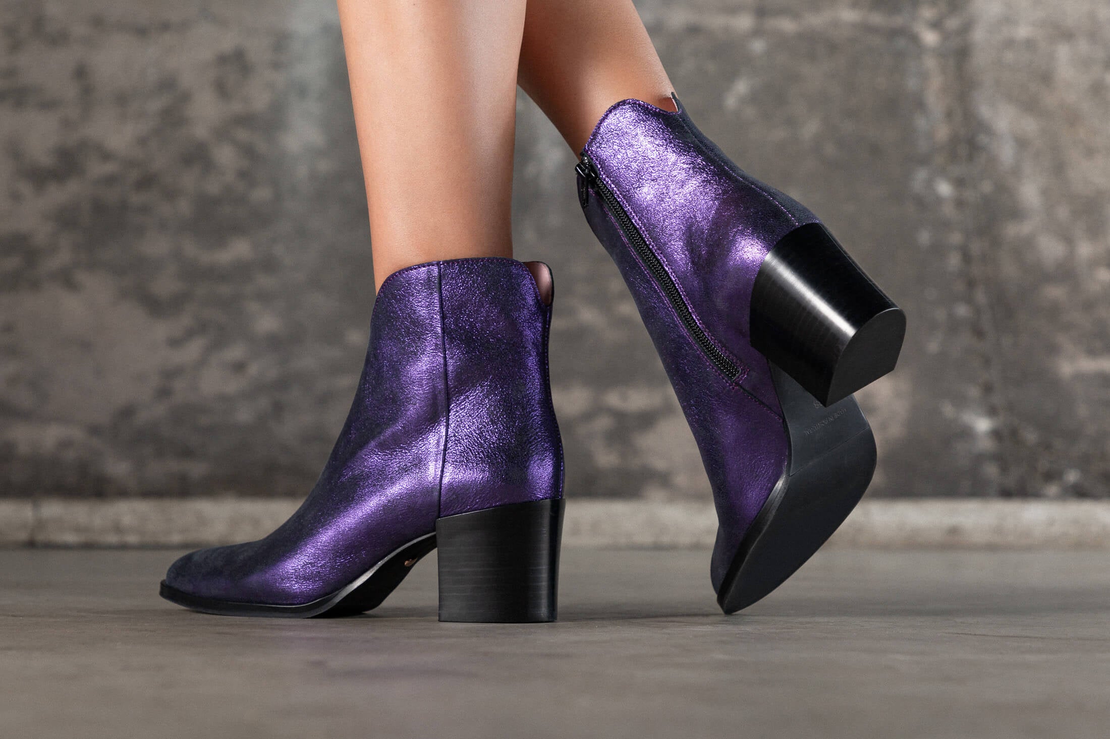Parce qu’elles sortent du lot — sans en faire trop. Le violet métallisé est sophistiqué, lumineux, presque envoûtant. Et parce qu’une bottine à talon qu’on peut porter toute la journée sans souffrir, c’est un vrai coup de cœur.