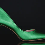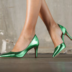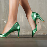 Les escarpins Hortense en cuir vert métallisé captent la lumière et subliment votre silhouette avec raffinement. Leur design échancré sur le côté dévoile juste ce qu’il faut pour une touche sensuelle et moderne. Leur talon fin de 8 cm élance la silhouette tout en restant confortable, parfait pour vous accompagner du bureau au dîner.